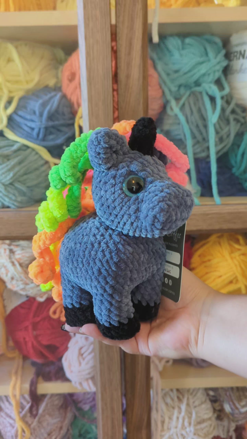 Color Description: Dark grey body with black hooves and horn. Her mane and tail are compromised of bright highlighter green, yellow, pink, and orange curls. Finished with custom hand-painted glitter safety eyes.