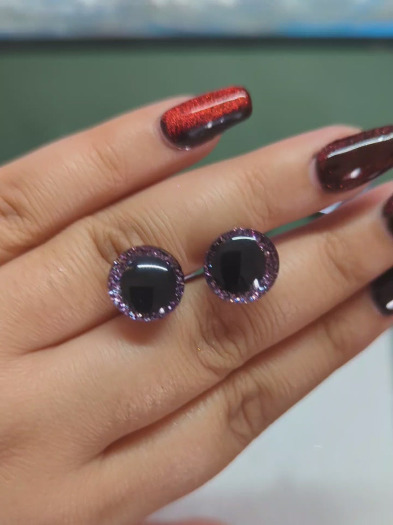 Starting with a set of 6 safety eyes - ranging from finer glitter to chunky glitter eyes, each one is hand-painted with UV-cured Gel Polish and finished using Dip Powder in various color combinations.